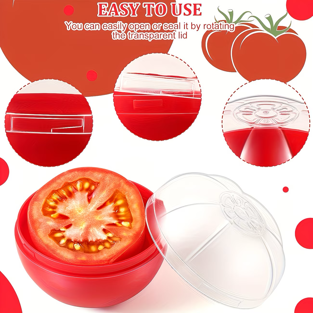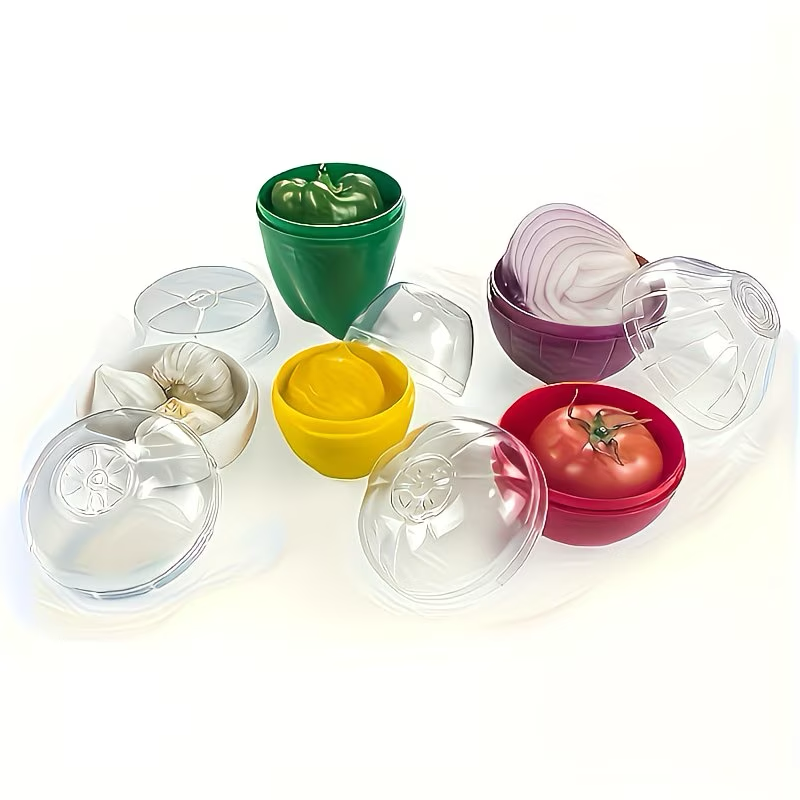 Reusable BPA-free storage containers for onion, garlic, tomato and lemon to keep food fresh longer.